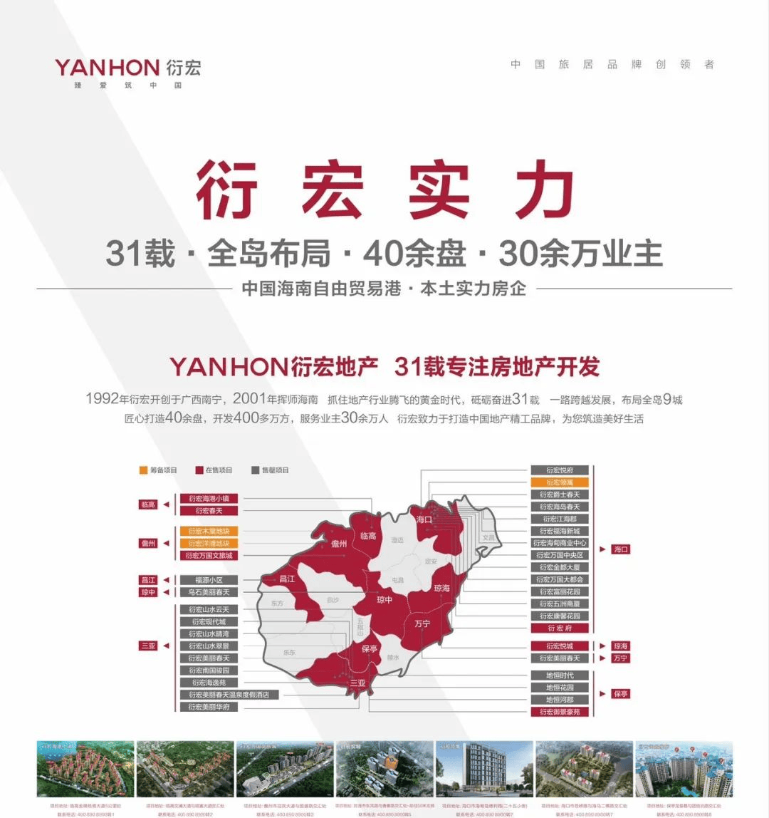 衍宏集团深耕中国31年,中国旅居品牌创领者,是一家集金融、地产、农业、健康四大板块于一体的综合型产业集团。衍宏先后打造衍宏万国大都会、衍宏富丽花园等30多个精品项目,开发面积400多万㎡,服务业主超30万,衍宏致力于打造中国地产精工品牌,为您筑造美好度假生活。