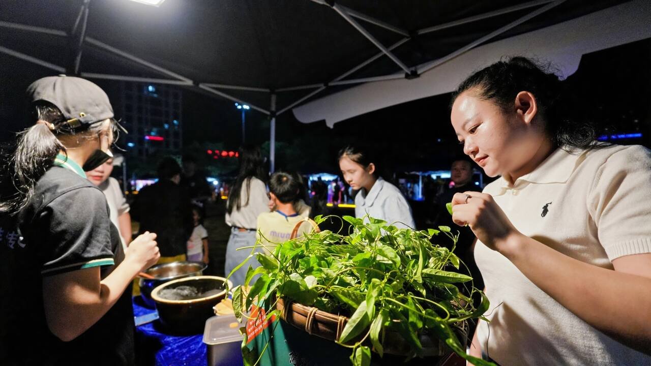 作为儋州人熟悉的传统美味,鸡屎藤系列美食摊位前,人头攒动,工作人员将新鲜鸡屎藤叶研磨成末,与糯米粉糅合制成各式点心,红糖鸡屎藤清甜爽口,鸡屎藤馍软糯香甜,独特风味让食客们赞不绝口。“小时候常吃长辈做的鸡屎藤,今天在市集尝到同款味道,一下子想起童年了。”游客李晶感慨道。
