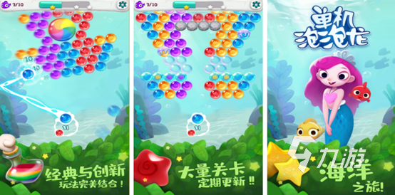 单机泡泡龙这款游戏不同于其他泡泡龙,除了精美场景的关卡以外,还有着游戏的剧情,为了解救小鱼宝宝玩家需要通过射击泡泡,让泡泡的数量达到一定的标准才能进行消除,而且每一关的泡泡队形都是不一样的,玩家要发挥自己的物理知识让泡泡去到指定的地方,更大程度的消除泡泡。