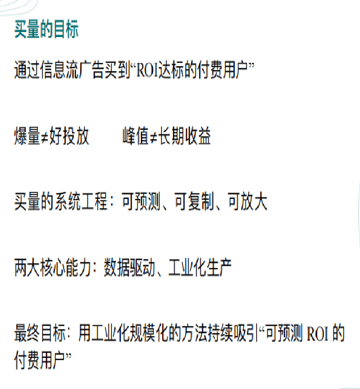 买量依赖两项核心能力:数据驱动:用数据贯穿整个投放过程;工业化生产:通过标准化、规模化的方式持续获取用户。