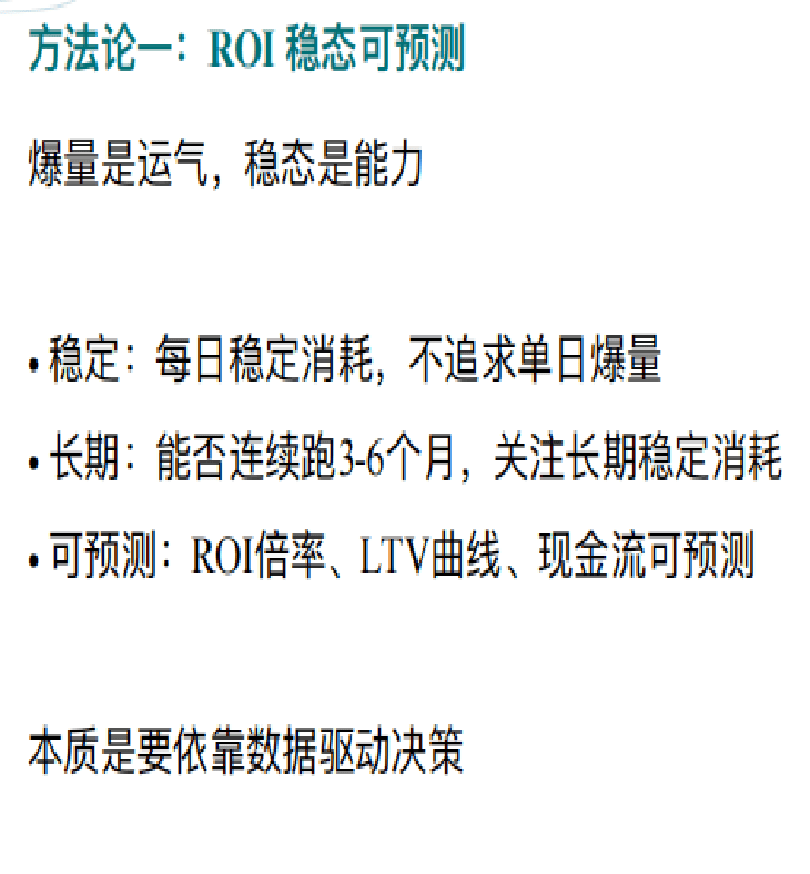 我们需要的是持续、稳态的高消耗,而非追逐单日爆量。一个有效的方法论,应当能支持游戏连续跑3~6个月。更重要的是,数据必须具备可预测性,尤其是ROI倍率、LTV曲线以及后续现金流能否跟上。