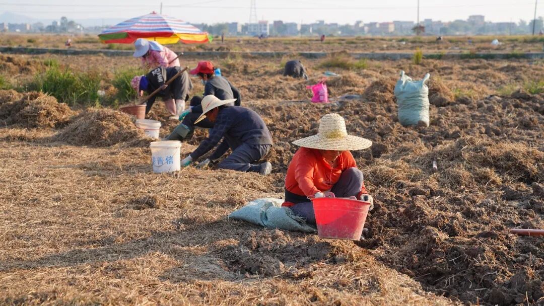 每逢开挖季,附近村民都会来基地干活,每天有300至500人在此采收,基地按每斤0.45元现称现结工钱,让大家在家门口就能挣到一份实在的收入。