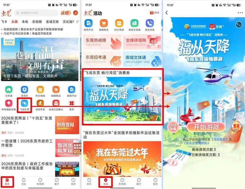 为让更多人便捷参与,本次发券渠道全面升级:除了原有的东莞+App、“东莞通”小程序及“东莞通”App外,还新增了东莞日报微信公众号、抖音号、视频号以及小红书官方账号等新媒体平台。大家可根据自己的使用习惯,提前定好闹钟,在指定时间进入相应平台参与抽奖。