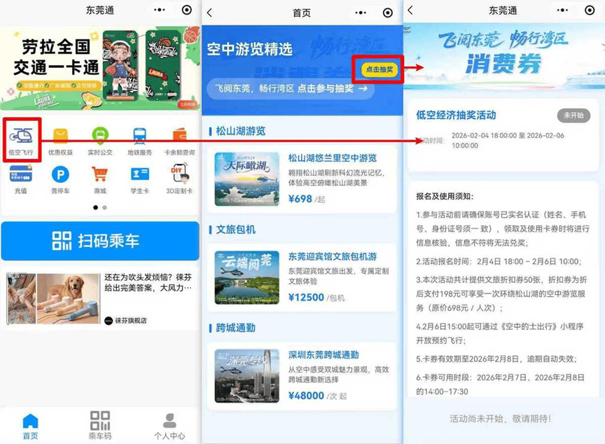 市民微信搜索东莞通小程序或打开东莞通App,点击首页“低空飞行”,点击抽奖,即可进入抽奖页面。