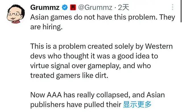 他们进一步吐槽,西方开发者之所以陷入如今的困境,核心就是拎不清——总以为把道德表演、政治正确置于游戏性之上是个好主意,忽视玩家核心需求,甚至把玩家视如草芥,久而久之,不仅玩家不买账,3A游戏也彻底,就连亚洲发行商也纷纷从西方公司撤资,落到这般境地纯属咎由自取。
