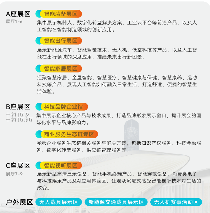 珠海会场以“贸易对接、订单拓展”为核心,展览面积5.2万平方米,约900家企业参展。设置智能装备、智能出行、智能家居、智能视听四大主题展区,覆盖从工业机器人、数字化转型方案到新能源汽车、低空科技的全产业链。特别设立科技品牌企业馆与商业服务生态链专区,为参展商提供从品牌展示到供应链服务的一站式解决方案。户外展区还将呈现无人载具、新能源交通载具及无人机赛事活动,让技术看得见、摸得着。